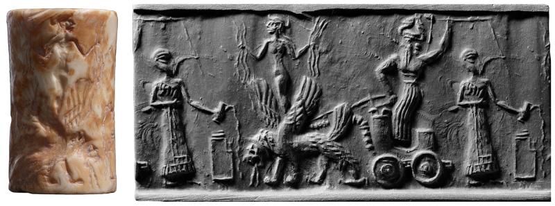 Worshiper pouring libation before goddess standing on lion-griffin that draws chariot driven by weather god