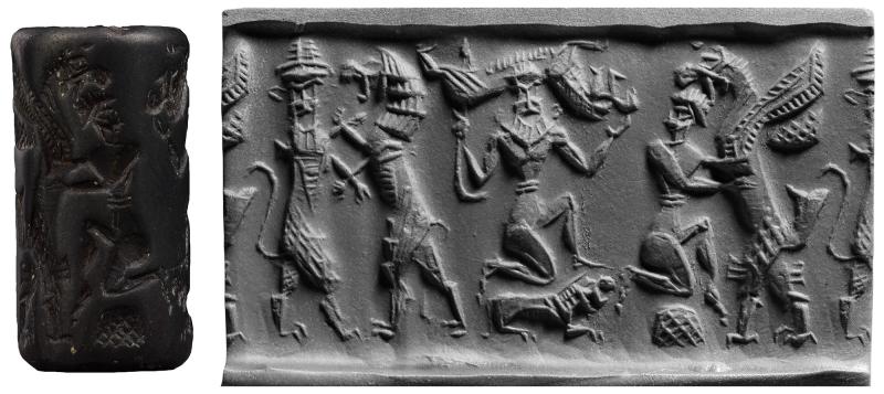 Two winged lion-demons flanking nude bearded hero with streams flowing over each shoulder