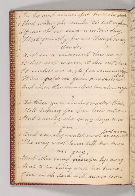 This untitled poem was presumably intended as the second part of the previous poem, “The Parting.” Brontë noted two dates at the end: the first, 1837, is the fictional date of composition by Alexandrina Zenobia; the second, 10 July 1838, is Brontë’s own date of composition (the day after she completed “The Parting”). First published in Poems (1902), pp. 192–94, with the incorrect title “The Lady of Abyerno’s Hall.” Published in The Complete Poems of Anne Brontë (London: Hodder & Stoughton, 1920) with the title “The Parting,” part II. Poem 7 in Chitham (1979); pp. 459–61 in Alexander (2010).