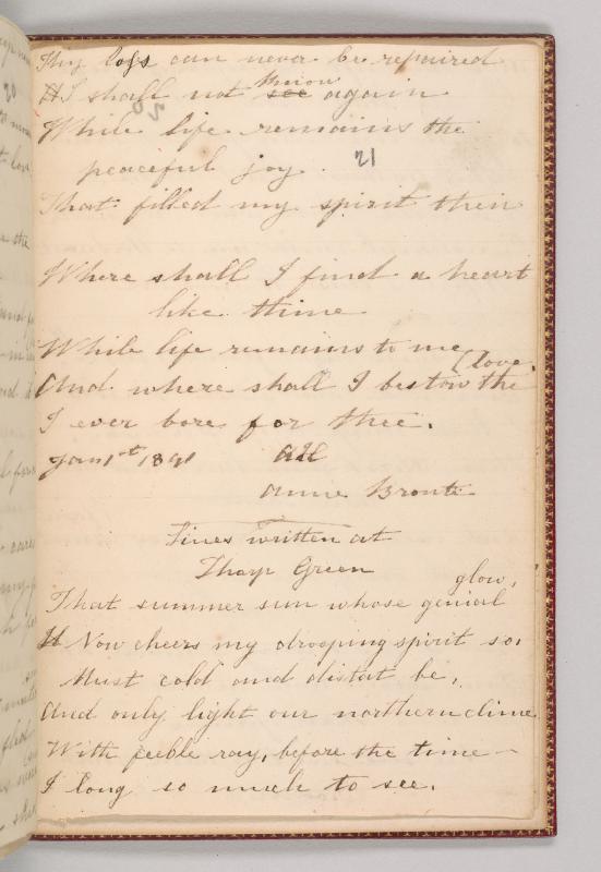 Composed 19 August 1841, when Brontë was twenty-one and working as a governess at Thorp Green Hall, near York. First published in Poems (1902), pp. 204–205, with incorrect title “Lines Written at Thays Green.” Poem 16 in Chitham (1979). Note that Brontë wrote another poem with the same title (see Chitham 11).
