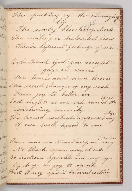 Composed on New Year’s Day 1840, when Brontë was about to turn twenty. This is the only composition in the notebook to be included in the first published book by Charlotte, Emily, and Anne Brontë, Poems by Currer, Ellis, and Acton Bell (London: Aylott & Jones, 1846). Titled “A Fragment” in the manuscript, “Self-Congratulation” in Poems. For publication, Brontë made several revisions, changing the first word from “Maiden” to “Ellen,” for example, removing the Gondal “signature” Olivia Vernon, and revising punctuation. Poem 9 in Chitham (1979); pp. 463–65 in Alexander (2010).