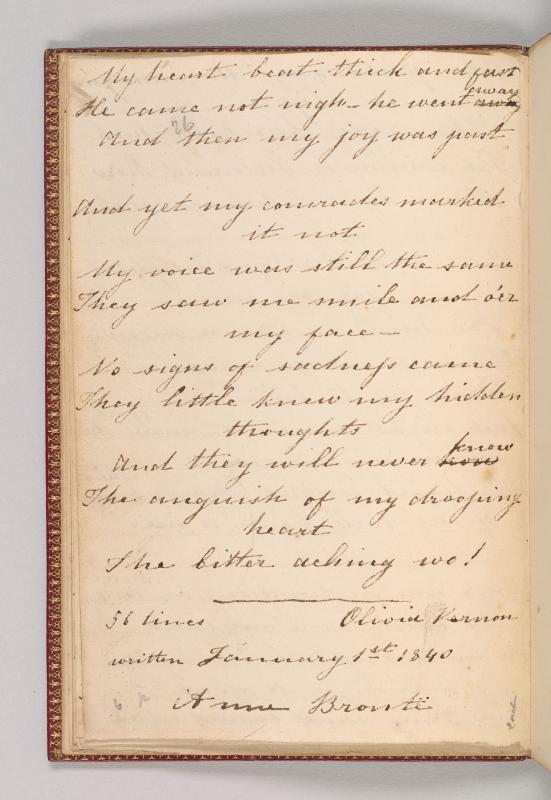 Composed on New Year’s Day 1840, when Brontë was about to turn twenty. This is the only composition in the notebook to be included in the first published book by Charlotte, Emily, and Anne Brontë, Poems by Currer, Ellis, and Acton Bell (London: Aylott & Jones, 1846). Titled “A Fragment” in the manuscript, “Self-Congratulation” in Poems. For publication, Brontë made several revisions, changing the first word from “Maiden” to “Ellen,” for example, removing the Gondal “signature” Olivia Vernon, and revising punctuation. Poem 9 in Chitham (1979); pp. 463–65 in Alexander (2010).