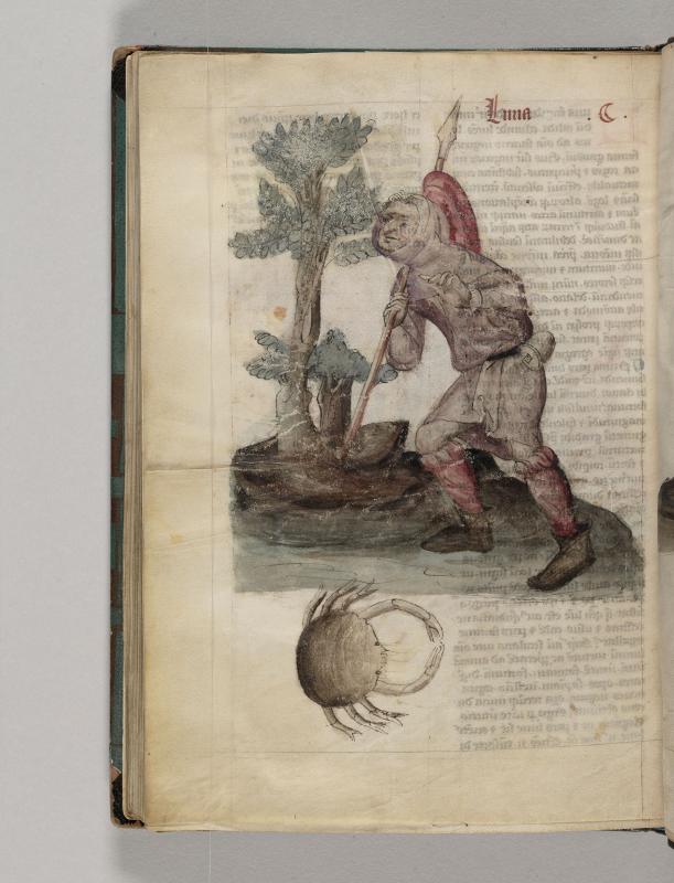 Personification: Moon (Moon in his House), and Zodiac Sign: Cancer -- Moon, inscribed LUNA, wearing hood, standing beside tree, holds spear in right hand.