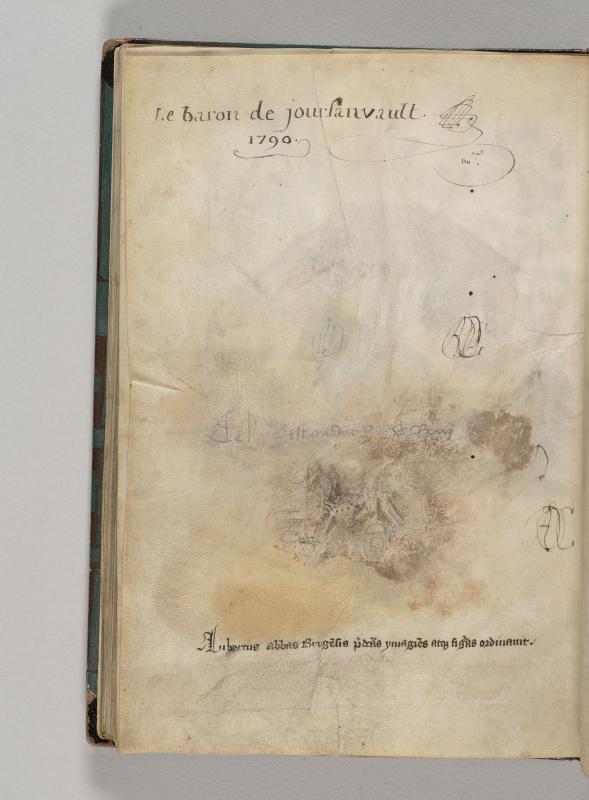 Inscription stating CE LIVRE ET AU DUC DU DE BERRI, above monogram of John, Duke of Berry (Jean de Berry). Below is second inscription stating LUBERTUS ABBAS BRUGENSIS PREDICTAS YMAGINES ATQUE FIGURAS ORDINAVIT.