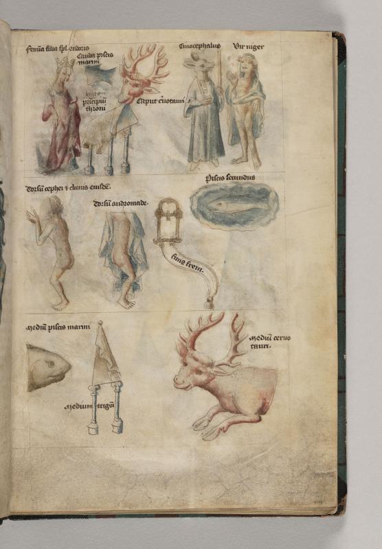 Virgo, inscribed FEMINA FILIA SPLENDORIS, crowned, holding skirts (Constellation: Virgo); fish tail, inscribed CAUDA PISCIS MARINI (Constellation: Pisces); draped three-legged object, inscribed TRIGONI PRINCIPIUM THRONI, supported by three columns (Constellation: Triangulum); hybrid stag-bull head, inscribed CAPUT CERUOTAURI (Astrological Sign: Cervotaurus); standing figure, inscribed CINOCEPHALUS, with dog head, holding unlit torch in left hand and key in right hand (Astrological Sign: Cynocephalus); and nude man, inscribed VIR NIGER, partially draped with mantle over his head (Astrological Sign: Vir Niger).