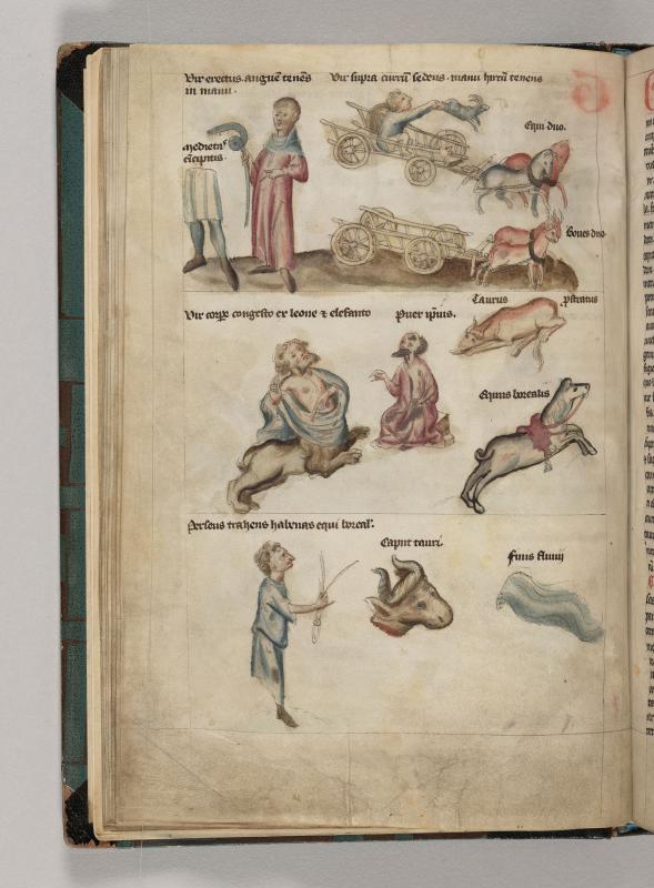 Partially draped man-lion hybrid inscribed VIR CORPORE CONGESTO EX LEONE ET ELEFANTO (Astrological Sign: Hybrid Figure), facing bearded man, inscribed PUER IPREIUS (sic), seated with right hand extended toward the hybrid man (Astrological Sign: unidentified); bull, inscribed TAURUS PROSTRATUS, lying down (Constellation: Taurus); horse, inscribed EQUUS BOREALIS, wearing saddle and bridle (Astrological Sign: Equus Borealis).