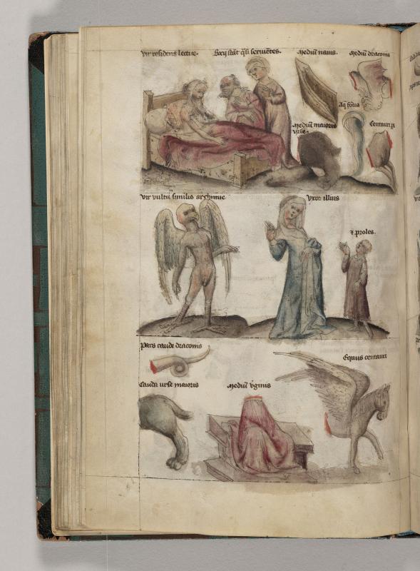 Man, inscribed VIR RESIDNS LECTUE (sic), wearing cap, sits in bed, beside which stand a man and woman, wearing head scarf, both inscribed SOCII STANT QUASI SERUIENTES (Astrological Sign: unidentified); prow of ship, inscribed MEDIUM NAUIS (Constellation: Argo Navis); hindquarters of bear, isncribed MEDIUM MAIORIS VRSE (Constellation: Ursa Major); stream of water, inscribed AQUA FONTIS (Constellation: Aquarius); winged body of dragon, inscribed MEDIUM DRACONIS (Constellation: Draco); forequarters of centaur, inscribed CENTAURI PARS (Constellation: Centaurus).