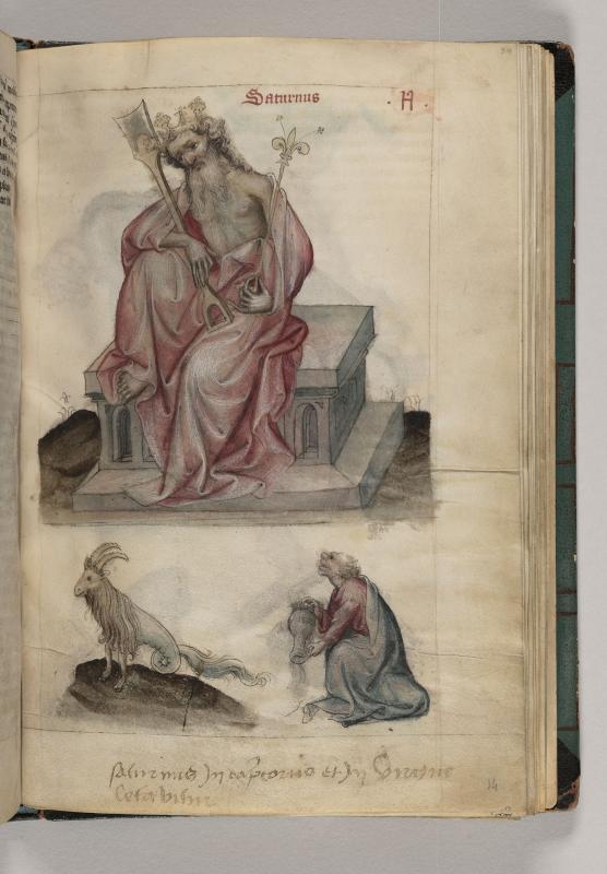 Personification: Planet, Saturn (Saturn in his Houses), Zodiac Sign: Capricornus, and Zodiac Sign: Aquarius -- Saturn, crowned, bearded, partially draped, sits on bench with right foot on seat and holds spade in right hand and scepter with fleur-de-lis in left hand.