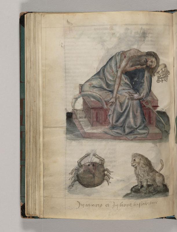 Personification: Planet, Saturn (Saturn in his Counter Houses), Zodiac Sign: Cancer, and Zodiac Sign: Leo -- Saturn, partially draped, seated on bench, slumps forward as crown falls toward ground. Spade leans against bench.