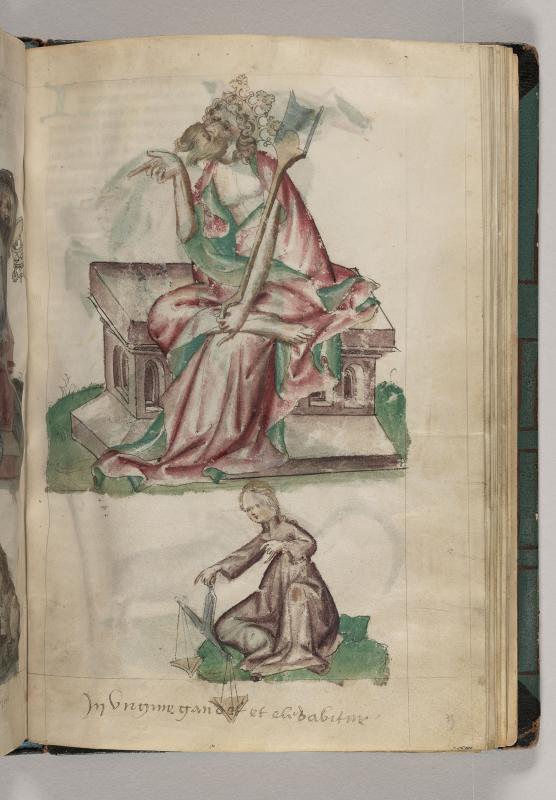 Personification: Planet, Saturn, (Saturn in Exaltation) and Zodiac Sign: Libra -- Saturn, crowned, bearded, partially draped, holding spade in left hand and with right hand raised, sits on carved bench with right leg crossed on left knee.