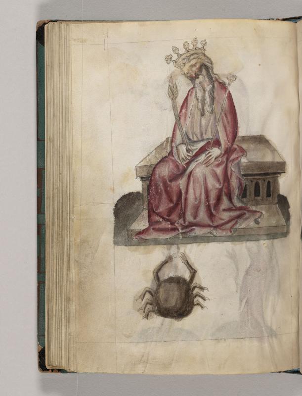 Personification: Planet, Jupiter (Jupiter in Exaltation), and Zodiac Sign: Cancer -- Jupiter, crowned, holding scepter in left hand and sheaf of grain in right hand, sits on bench.