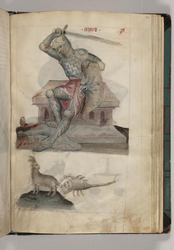 Personification: Planet, Mars (Mars in his Houses), Zodiac Sign: Aries, and Zodiac Sign: Scorpio -- Mars, wearing armor, holding raised sword in right hand and bird-faced shield in left hand, sits on bench with decapitated figure at his feet.
