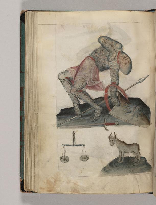 Personification: Planet, Mars (Mars in his Counter Houses), Zodiac Sign: Libra, and Zodiac Sign: Taurus -- Mars, wearing armor, holding bird-faced shield in left hand, swoons backward toward ground, upon which are spear and sword.