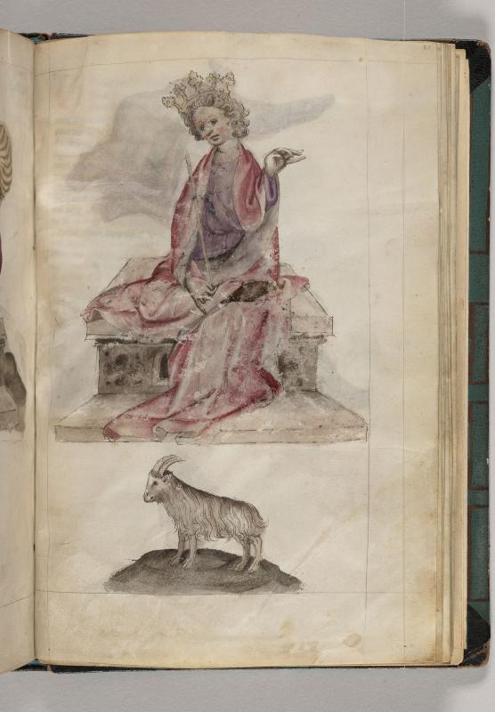 Personification: Sun (Sun in Exaltation), and Zodiac Sign: Aries -- Sun, crowned, holding scepter in right hand and with left hand raised, sits on carved bench.