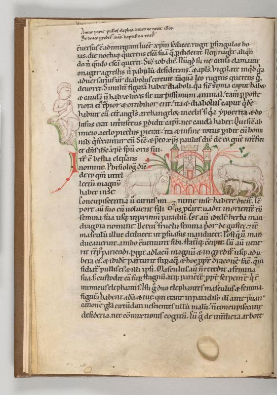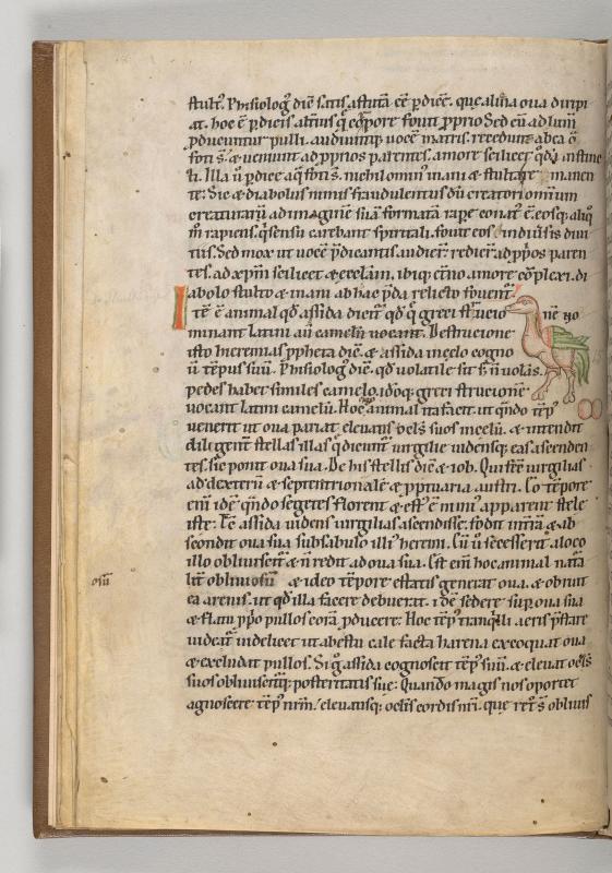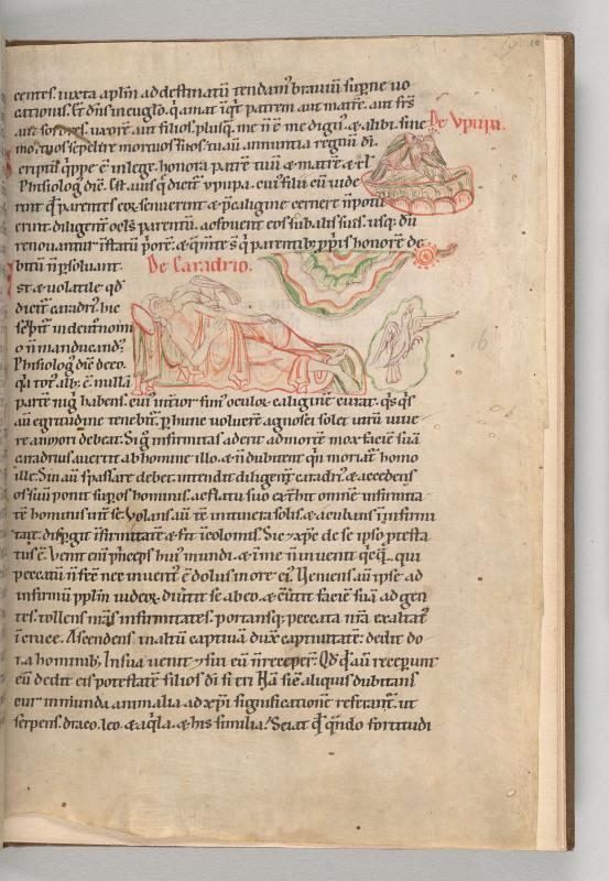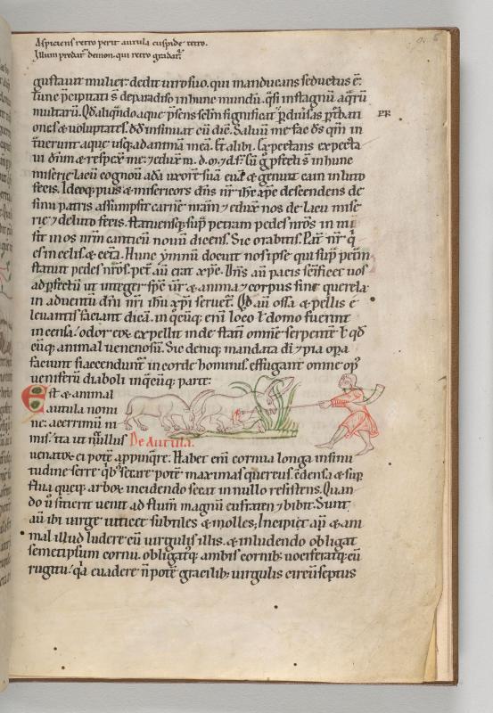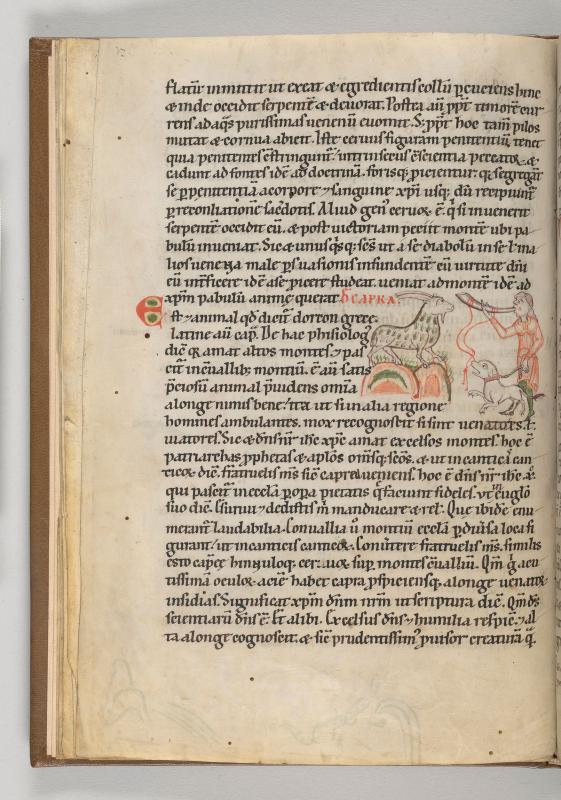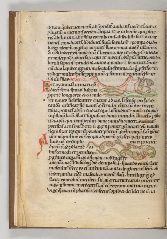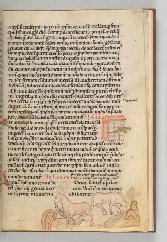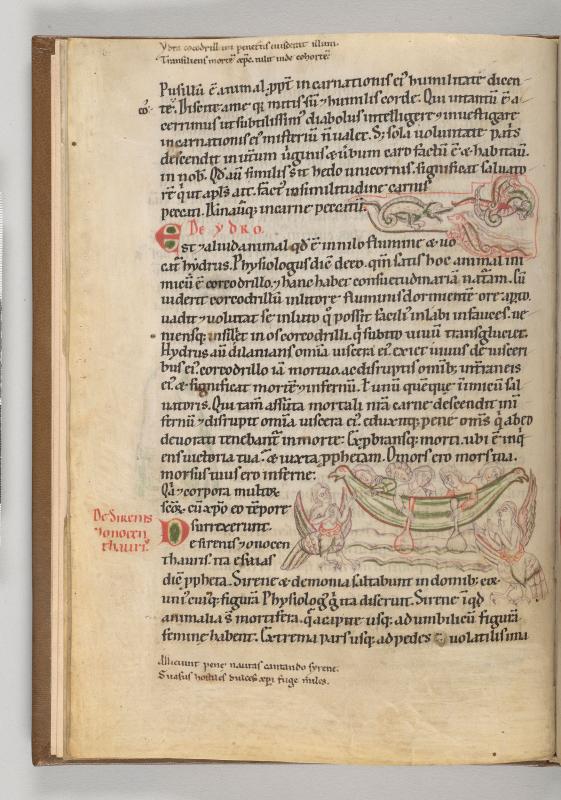 Monastic learning included texts on the natural world. A characteristic example from the important Benedictine monastery at Göttweig, this compilation of animal lore is based on ancient and early medieval sources. Beginning with the lion and ending with the phoenix, the text describes some thirty different animals, both real and imaginary. At upper left is the hydrus, legendary enemy of the crocodile; directly below are sirens, birdlike beasts that prey on sailors. At upper right is the onocentaur, a half-man, half-donkey hybrid; below that are sex-changing hyenas, related to sodomy; and the creature at lower right is a braying onager, symbol of the devil. Added later, rhyming couplets in the margins offer typological and moral interpretations of the animals, of a type also featured in the encyclopedic Concordance of Charity.
