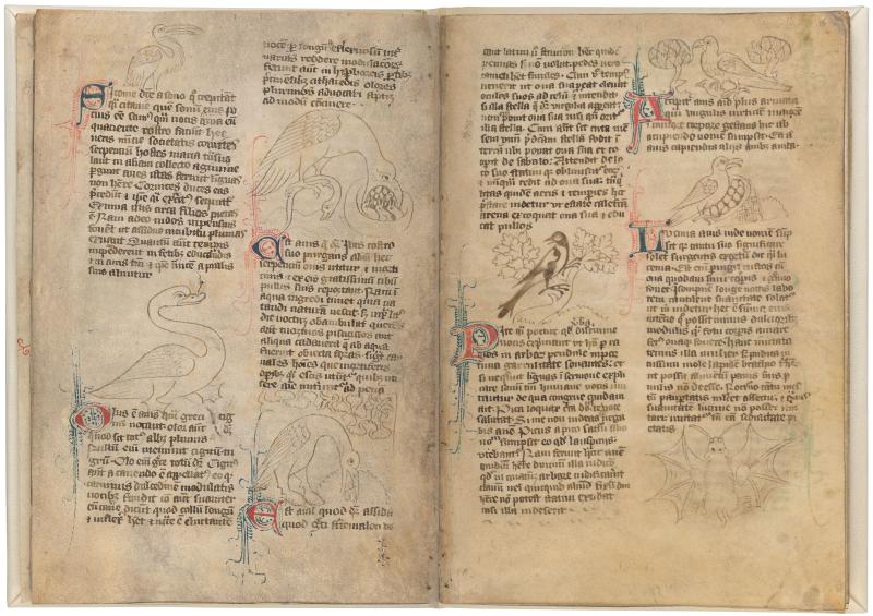 Bat: Although included with the birds, the bestiary notes that the bat, shown with membranous wings outstretched, gives birth to live young and eats with teeth, not a beak.