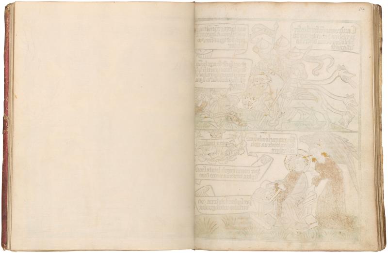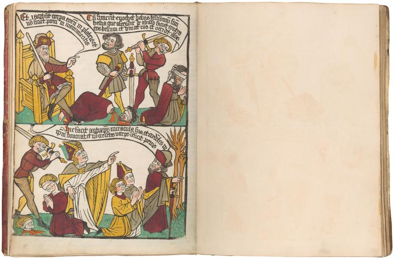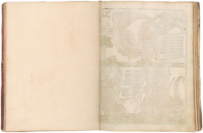 PML 8 belongs to a group of copies identified as Schreiber’s Edition V, the woodblocks for which were produced in Germany (perhaps around Mainz or Strasbourg) about 1468 and copies were printed from those blocks until about 1475. The Morgan copy is incomplete, retaining only 32 of the 48 original leaves (12–14, 16, 21–48/F2–G2, H2, L1–ZZ2), with modern blank paper added to replace all of the missing leaves. One of these leaves is now at the British Library (IB.16), but the remainder of the missing leaves are currently unknown. In PML 8, leaves 22 (L2) and 23 (M1) were transposed in printing, as is also seen in Bodleian Library copy (Auct. M 3.14).