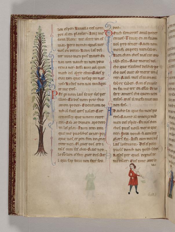 Left Margin:Man halfway up tree, grasping trunk with both hands.Lower Margin:Man playing rebec.Text of poem by Folquet de Marseille (Folquet de Marselha).