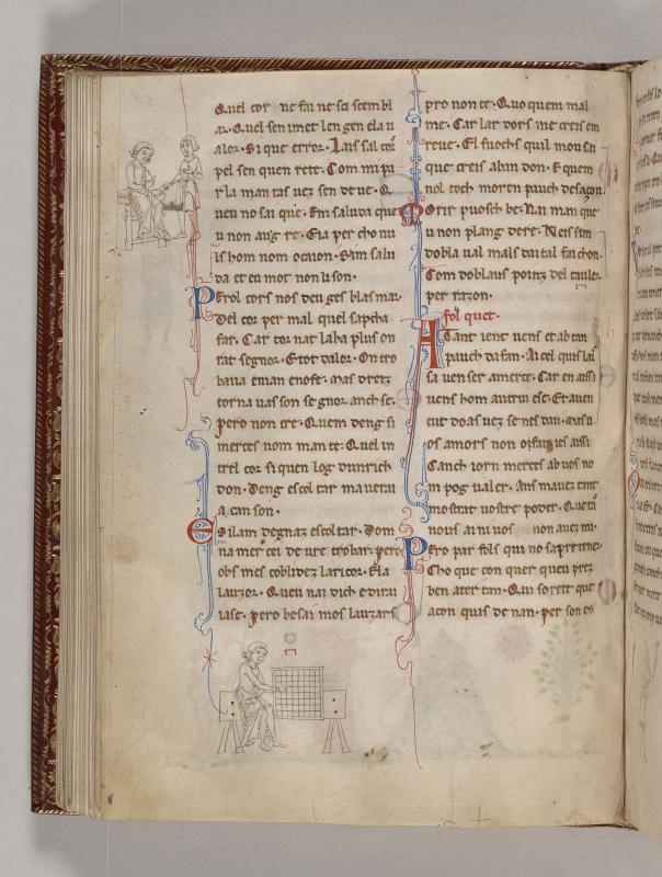 Left Margin:Man, probably poet, supporting left arm with right hand, left hand held to face, sitting cross legged on cushioned bench, opposite man, standing, indicating the poet with right hand, left hand on breast.Lower Margin:Man, probably poet, seated