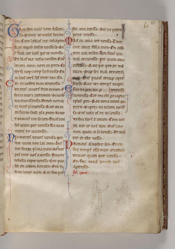Lower Margin:Man, left hand on breast, extending right hand holding round object toward woman, gesturing with both hands, looking toward him, seated on bench.Text of poem by Folquet de Marseille (Folquet de Marselha).