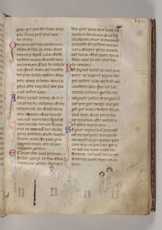 Lower Margin:At left, candle; personification of sun looking down at flowering plant.Christ: Crucifixion -- Christ, nimbed, wearing loincloth, is affixed with four (?) nails to cross with blank titulus and suppadaneum. Virgin Mary, nimbed and veiled, hold