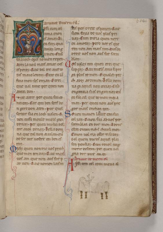 Initial:Half-figure of man gesturing with right hand, holding rod with left hand, within initial A deocrated with foliate ornament.Lower Margin:Man, probably poet, eyes shut, arms raised, reclining in draped bed.Text of poem by Arnaut de Maruelh.