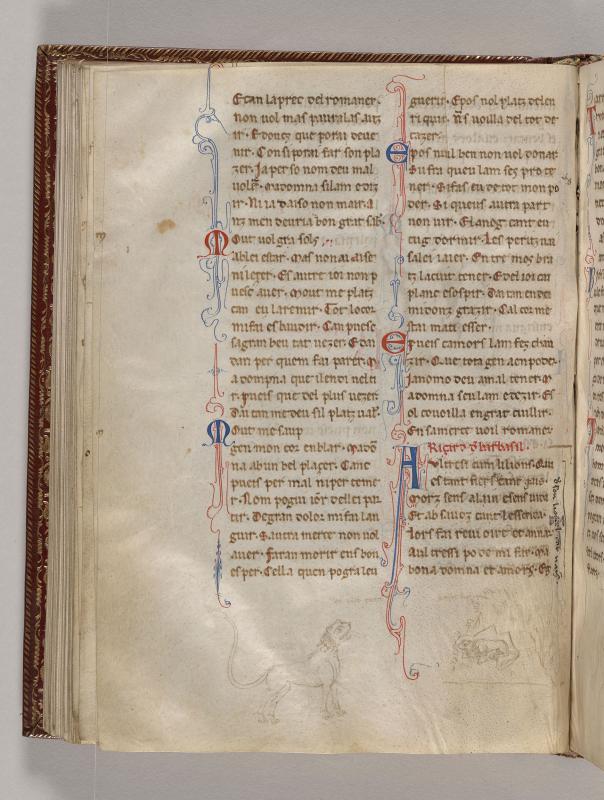 Lower Margin:At left, lion, tongue emerging from open mouth, opposite young in cave.Text of poem by Rigaut de Berbezilh.
