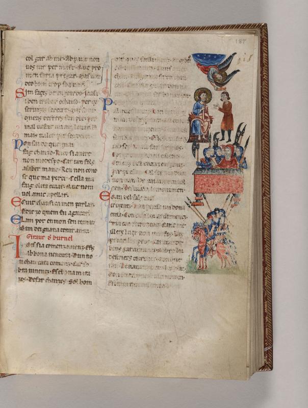 Right Margin:Christ: Scene -- Christ, nimbed, raising right hand in gesture of blessing is seated on cushioned bench. He looks toward man, hands extended; above angel, nimbed, descends from arc of heaven holding with right hand crown above head of the man