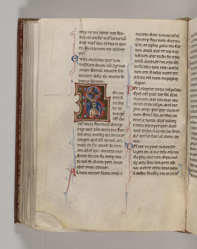 Half figure of man, gesturing with both hands within initial B decorated with foliate ornament.Text of poem by Guilhem de Sant Leidier.