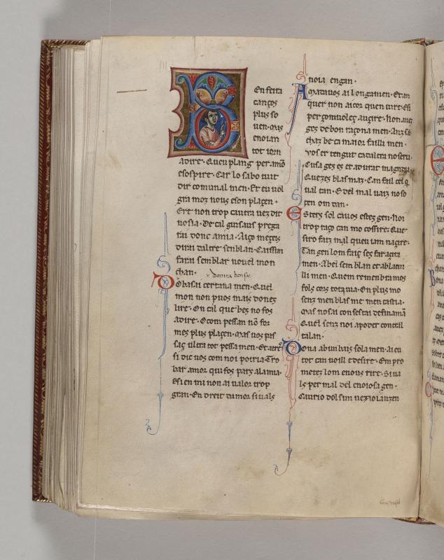 Bust of man, gesturing with right hand in lower half of initial B decorated with foliate ornament.Text of poem by Gui d'Ussel.