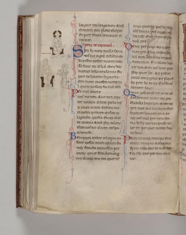 Left Margin:Christ, crossed nimbus, right hand in gesture of blessing, holding roll with left hand, seated on cushioned bench.Below, woman, right hand grasping cord of cloak, seated on cushioned bench; poet, hands extended, kneeling before her.Text of poe