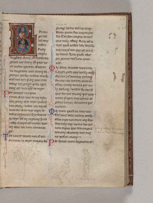 Within initial B, in upper loop, bust of man holding rod; in lower loop half-figure of man wearing fillet, holding rod with right hand, raising left hand.Lower Margin:Tree in which are four birds.Poet, semi-reclining, gesturing with right hand and looking