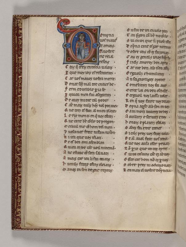 Within initial D, three-quarter figure of woman wearing fillet, grasping with right hand cord of cloak, and with left hand holding fold of the fur lined cloak. Initial D terminating with head or mask of animal.Text is poem by Charles d'Anjou.