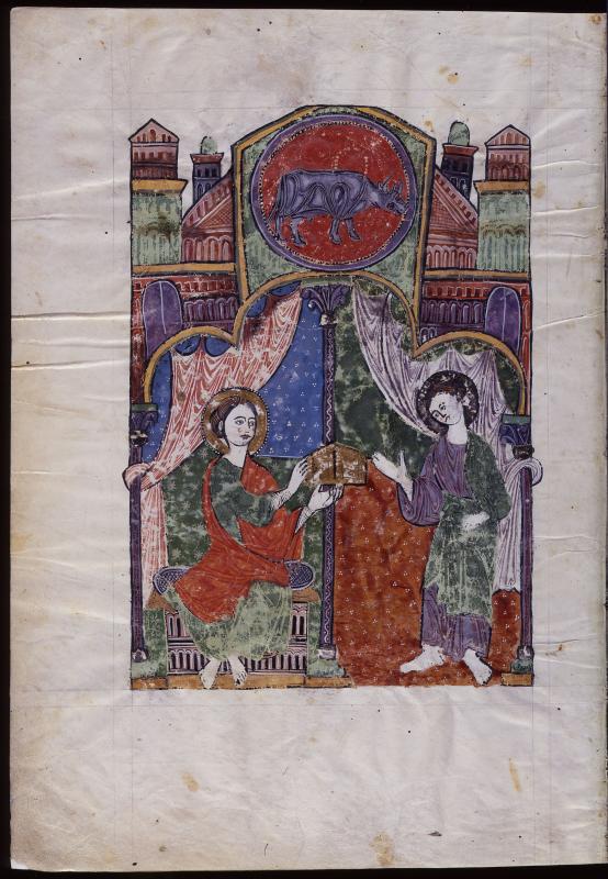 In draped architectural frame, Christ beardless, pearled nimbus, seated on cushioned bench, giving open book to Evangelist Luke, decorated nimbus; above, in medallion in gable, symbol of Evangelist Luke; starred and decorated background.