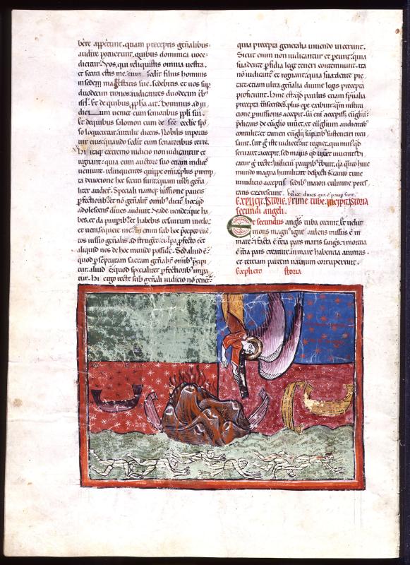 Apocalypse: Trumpet II, Burning Mountain (Revelation 8:8-9) -- Half figure of nimbed angel sounding trumpet; below, burning mountain falling into sea containing boats and six corpses; starred and decorated background; background inscribed UBI MONS MAGNUS MISSUS EST IN MARE.