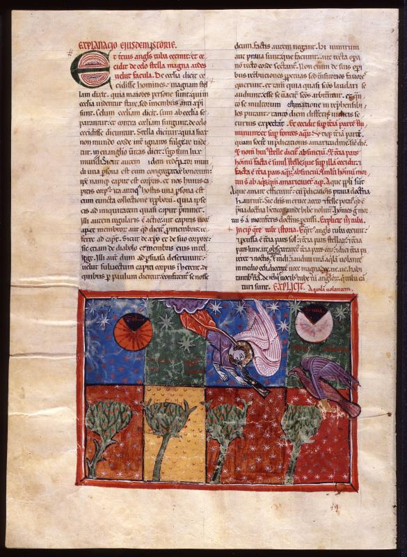 Apocalypse: Trumpet IV, Partial Darkness; and Cry of Three Woes (Revelation 8:12-13) -- Nimbed angel, issuing from cloud, sounding trumpet; stars, sun, SOLUS, and moon, LUNA, third part darkened; to right, eagle, AQUILA UOLANTEM; below four trees; starred and decorated background inscribed ET QUARTUS ANGELUS TUBA CECINIT.