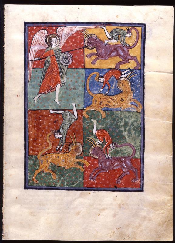Apocalypse: Trumpet V, Locust Plague (Revelation 9:4-11) -- Apollyon, pearled nimbus, holding shield, attacking with spear one of four locusts represented as horned fantastic animals wearing disks representing crowns, stinging men with their serpent-tails; starred background; background inscribed UBI LOCUSTE.