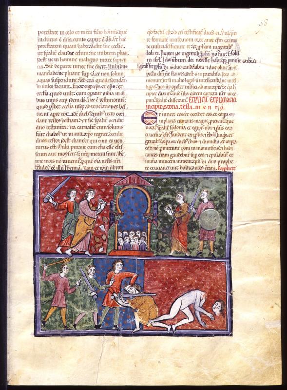 Apocalypse: Witnesses slain (Revelation 11:7) -- Four men armed with swords, spades? and shield, destroying city gate of Jerusalem, men within; below, three men armed with mace and swords, one decapitating one of two witnesses; decapitated corpse of second witness to right; starred and decorated background; frame inscribed ANTICHRISTUS CIUITATEM IHERUSALEM SUBUERAT.