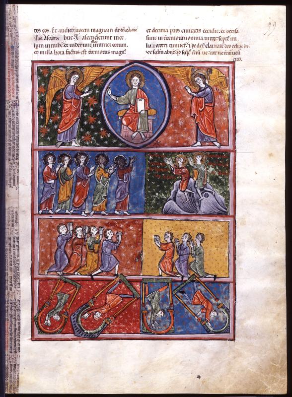 Apocalypse: Witnesses, Ascension (Revelation 11:12-13) -- Christ, pearled nimbus, holding book, seated on cushioned bench in decorated mandorla flanked by two angels, pearled nimbi.