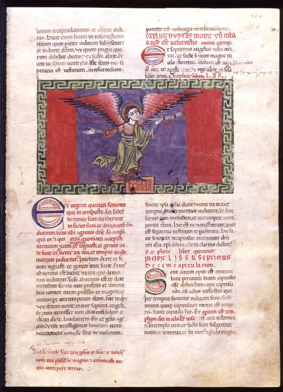 Apocalypse: Trumpet VII, Adoration in Heaven (Revelation 11:15) -- Nimbed angel, left foot on footstool, sounding trumpet; inscription UBI SEPTIMUS ANGELUS.