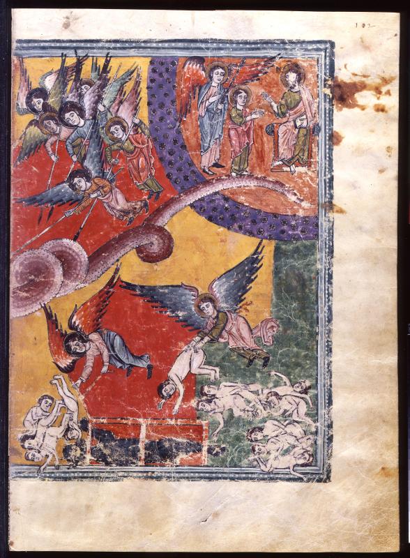 3) Apocalypse: Dragon attacked by Michael (Revelation 12:7-8) -- Six nimbed angels armed with spears, attacking the Dragon on facing folios 101v-102r, inscription UBI DRACHO TRAXIT TERCIA PARS STELLARUM.