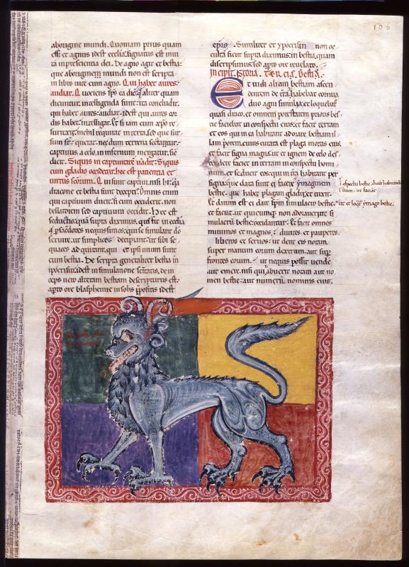 Apocalypse: False Prophet and Beast. Apocalypse: False Prophet and Beast (Revelation 13:11) -- False Prophet as horned animal; Beast not represented; inscription UBI BESTIA ASCENDET DE TERRA.