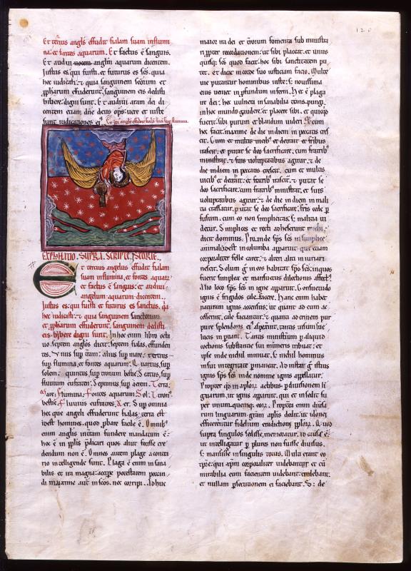Apocalypse: Vial III, Rivers of Blood (Revelation 16:4) -- Nimbed angel issuing from cloud, pouring out vial upon rivers and fountains; starred background; inscribed on top of frame ET TERCIUS ANGELUS EFFUDIT FIALA SUPER FLUMINA.