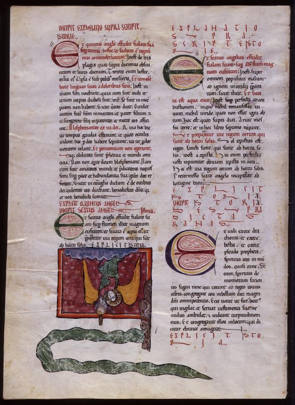 Evidently insufficient space was left for the miniature, so the Euphrates flows from the vertical brown earth into the margin and in the direction of the large miniature on the opposite page (exhibited at the right), which continues the story. According to the commentary, the kings are saints who will be taken away by Christ.