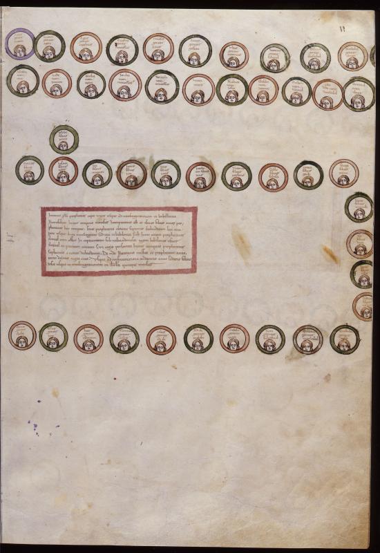 Tree: Genealogical. Heads in medallions of genealogical tree. Beatus of Valcavado, In Apocalipsin, Praefatio.
