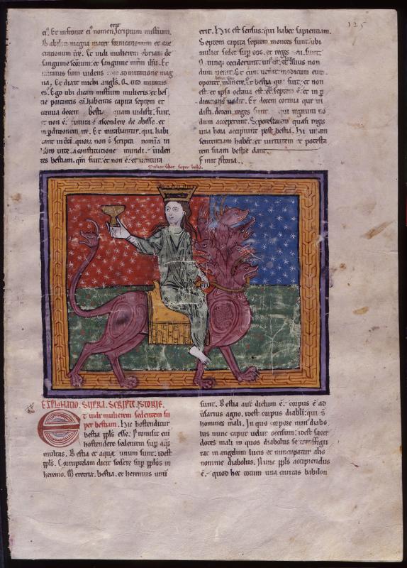 The whore, sitting on a scarlet beast, wears a Moorish crown; her long, loose hair suggests her licentiousness.