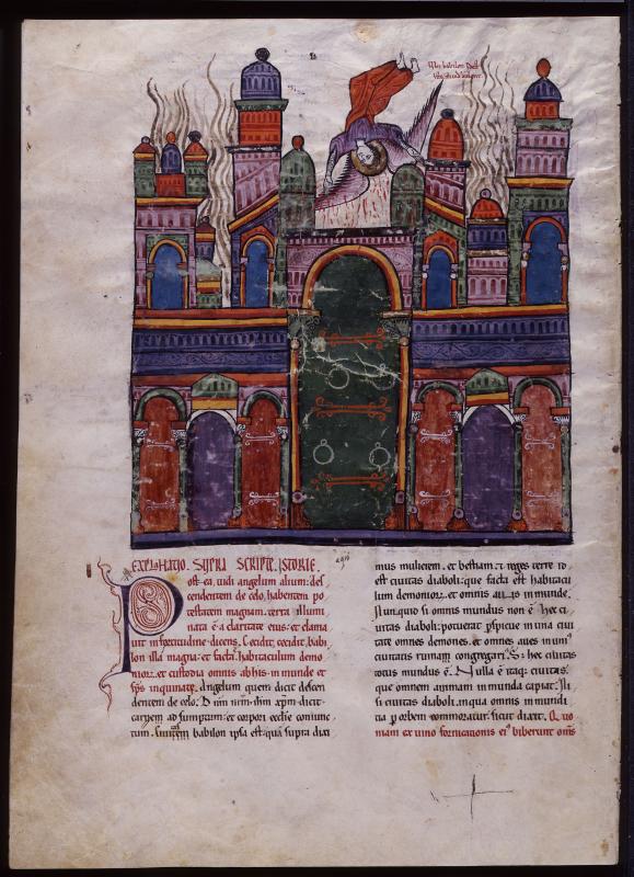 Apocalypse: Babylon, Fall (Revelation 18:1-3) -- Nimbed angel flying down to burning city gate; inscription in upper margin, UBI BABILON ID EST ISTE MUNDUS ARDENT.
