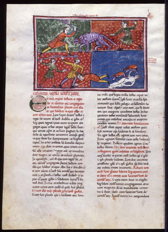 Apocalypse: Beast and False Prophet taken (Revelation 19:20-21) -- Beast held by rope about neck by one of two men attacking it with mace and spear. Below, two men armed with maces, one grasping hair of False Prophet, prostrate; two birds pecking at corpse;