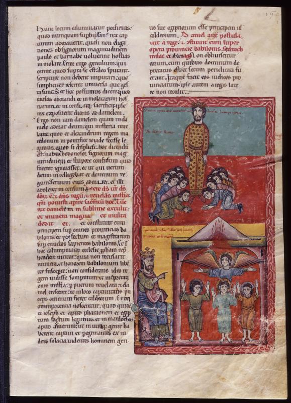 Three Hebrews: in Fiery Furnace (Daniel 3:23-25) -- Nebuchadnezzar crowned, seated on cushioned bench, pointing to Three Hebrews nimbed, one with pearled nimbus, before angel, pearled nimbus, in furnace with fire ascending from opening; background inscribed NABUCODONOSOR IUSSIT TRES PUERIS MITTERE IN FORNACEM.