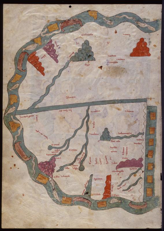 Map -- Fish, boats and islands, inscribed, in water surrounding rivers, countries and cities, inscribed, some represented as buildings; other half of map on facing page, fol. 32r.